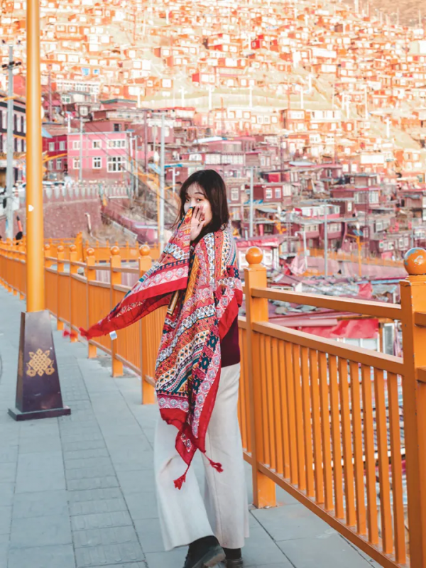 2.山坡上可以拍到佛學院宏偉壯觀的全景,但要注意不可攀登掛滿經(jīng)幡、堆砌瑪尼石的區(qū)域。