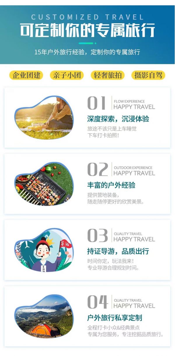 私人訂制:我們業(yè)務(wù)范圍囊括了全國(guó)各大城市,川西、西北、西藏、新疆,在路上永遠(yuǎn)有我們的身影。我們將為每一個(gè)有定制需求的你策劃出獨(dú)屬于自己的完美旅行。