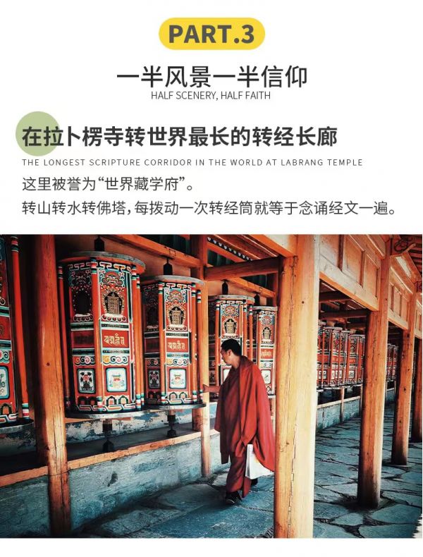 繼續(xù)往前【拉卜楞寺】,有“世界佛學(xué)院”之稱的【拉卜楞寺】。拉卜楞寺是藏傳佛教格魯派六大宗主寺之一 , 規(guī)模僅次于布達(dá)拉宮,是藏傳佛教格魯派最高佛學(xué)學(xué)府之一,被世界譽(yù)為“世界藏學(xué)府”,相當(dāng)于我們眼中的“清華北大”。在漫長(zhǎng)的發(fā)展中拉卜楞寺形成了獨(dú)特的藏傳佛教文化,包括建筑、學(xué)院、法會(huì)、佛教藝術(shù)、藏經(jīng)等,曾經(jīng)是甘、青、川毗鄰地區(qū)藏族的政治、宗教、文化中心。在學(xué)院堪布的帶領(lǐng)下來(lái),進(jìn)入寺院,欣賞美麗的壁畫(huà)、唐卡,精美佛像;走過(guò)朱紅玄黃長(zhǎng)廊,和喇嘛一起撥動(dòng)轉(zhuǎn)經(jīng)筒;在這紅白相間的宏偉寺院中,看虔誠(chéng)的信徒磕著等身長(zhǎng)頭來(lái)此轉(zhuǎn)經(jīng);與僧人一起聽(tīng)經(jīng)、打坐,靜靜感受這份信仰的力量。而后經(jīng)過(guò)【瑪曲】,母親河黃河這里自西南入境,復(fù)從西北出境。