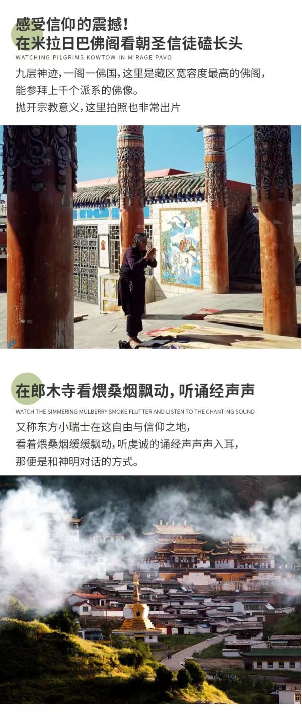 而后前往米拉日巴佛閣。甘南擁有最密集、最豐富的藏傳佛教寺廟,【米拉日巴佛閣】便是其中最著名的代表作,被稱為“九層神跡”。米拉日巴佛閣是藏傳佛教噶舉派(白教)在安多藏區(qū)的代表寺院,閣內(nèi)主要供奉藏傳佛教史上最富傳奇色彩、婦孺皆知的米拉日巴尊者,他同時(shí)也是噶舉派創(chuàng)教者之一。米拉日巴佛閣樓高共九層,有以金剛為主的四密乘的眾多佛像、菩薩、護(hù)法神等各類佛像1720尊,還有規(guī)模巨大的反映藏傳佛教內(nèi)容的各類壁畫(huà),繪畫(huà)技法高超,具有很高的藝術(shù)價(jià)值。在這里聽(tīng)聽(tīng)米拉日巴尊者的傳奇故事,了解藏傳佛教各個(gè)教派的歷史,在僧人呢喃佛音中感受那份信仰的虔誠(chéng)。