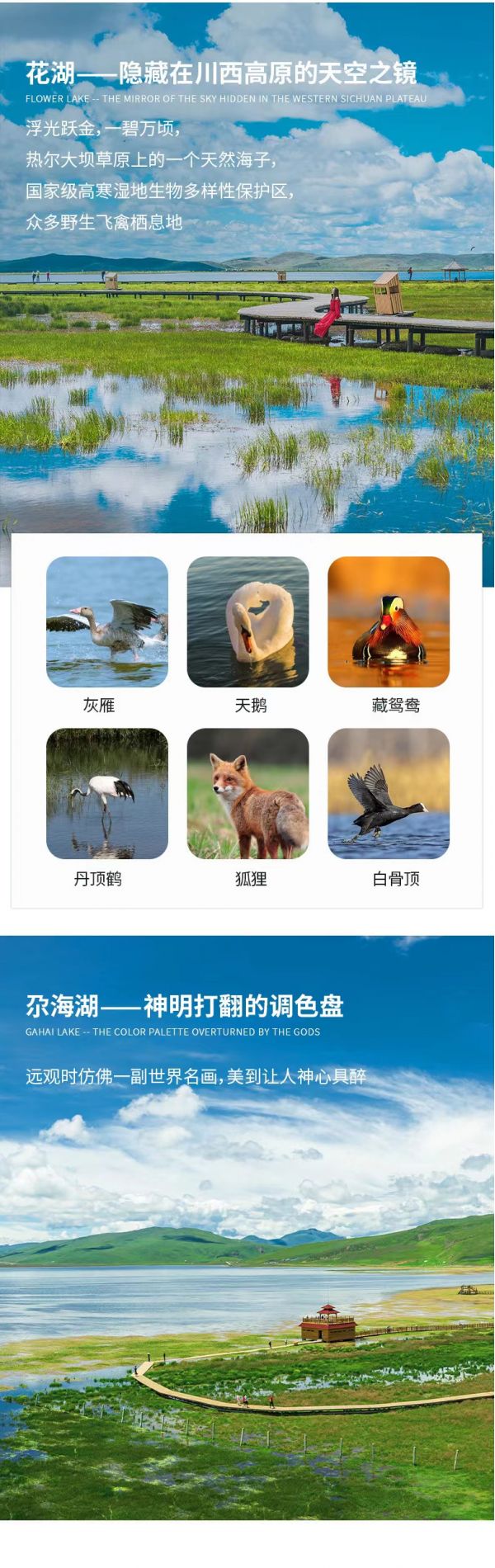 然后我們前往草原湖泊【花湖】。在僅次于呼倫貝爾草原的熱爾大壩草原之上,有一個(gè)絕美的天然海子---花湖。花湖濕地屬于國(guó)家級(jí)高寒濕地生物多樣性保護(hù)區(qū),是眾多野生飛禽的主要棲息地,如灰雁、白骨頂、天鵝、黑頸鶴、丹頂鶴、藏鴛鴦、狐貍等。花湖的夏天和秋天別有一番風(fēng)味。夏天,號(hào)稱“天空之境”的花湖,周邊開(kāi)滿野花,美輪美奐。秋天,廣闊的草原變成一片金黃,藍(lán)色的花湖被包圍其中,仿佛金色地毯上的一顆藍(lán)寶石。湖邊建有木質(zhì)棧道,一直延伸到水中,可以沿著棧道走到濕地深處,沿途都可以找到拍大片的好角度。