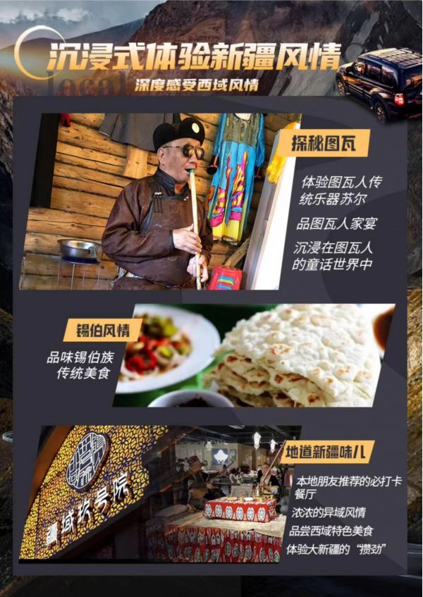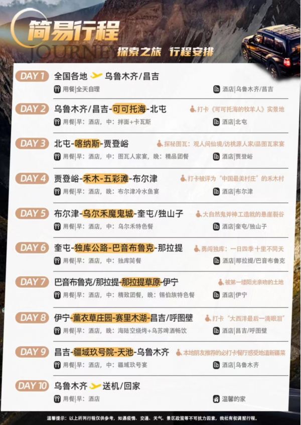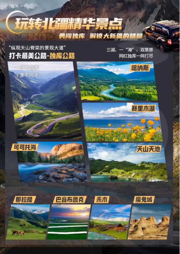 5.贈(zèng)送:天池區(qū)間車、喀納斯區(qū)間車、禾木區(qū)間車、可可托海區(qū)間車、魔鬼城區(qū)間車、那拉提區(qū)間車、巴音布魯克區(qū)間車。