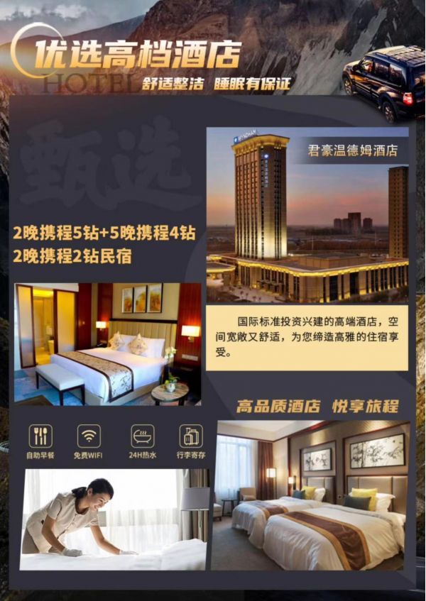 烏魯木齊五鉆參考酒店:尊茂鴻福大酒店/南航明珠國(guó)際酒店/君豪溫德姆大酒店/銀星酒店或同級(jí)別酒店;