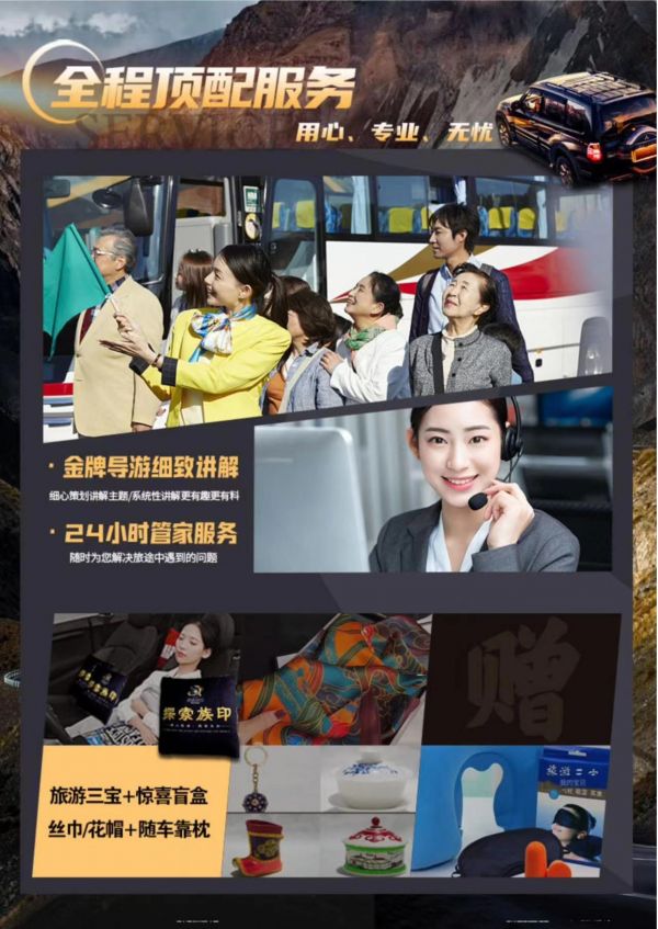 11.贈(zèng)送:全程每人每天1瓶礦泉水/女士絲巾/男士花帽/干果小禮包/驚喜盲盒/隨車抱抱枕/旅游三寶.
