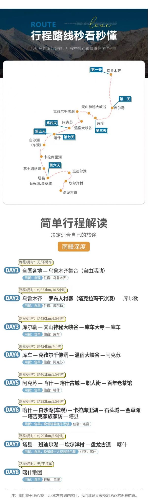 當(dāng)天車程較長,從北疆穿越天山甘溝進(jìn)入南疆腹地,氣候變化較大,請適當(dāng)增減衣物,注意補(bǔ)充水分??商崆百徺I一些零食,以備不時之需。
