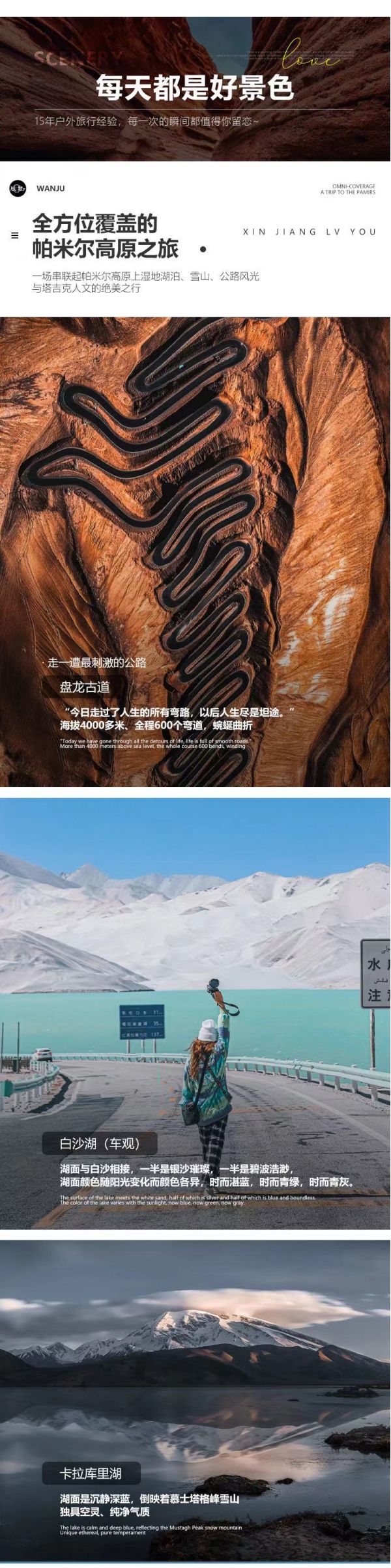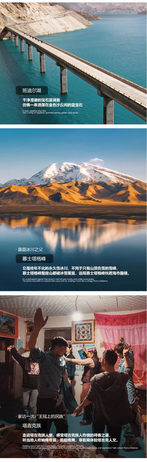 告別“東方摩洛哥”—喀什,我們將開啟一段帕米爾高原之旅。沿314國道一路暢游帕米爾高原風(fēng)光,首先驚艷我們的是背靠白色沙丘和雪山的【白沙湖】,在陽光的變化下,湖水時而呈湛藍(lán)色,時而呈綠色。更令人驚嘆的是,藍(lán)色的湖面與白沙相接,一半藍(lán)一半白,而白沙背后還有雪山。在雪山和白沙的映襯之下,白沙湖水更顯澄澈。在這里能get湖泊、白沙、雪山同框的畫面。分享一個冷知識:白沙湖又名流沙河,就是西游記里唐僧收服沙和尚的地方。我們還能途觀慕士塔格峰,山頂常年皚皚白雪,猶如滿頭白發(fā),十余條冰川鑲嵌在峰體下的峽谷中,如胸前飄動的銀須,故有“冰山之父”的美稱。隨后我們將遇見【卡拉庫里湖】,這里能看到雪山倒映在湖面的風(fēng)景,拍出來的照片特別的給人純凈的感覺。