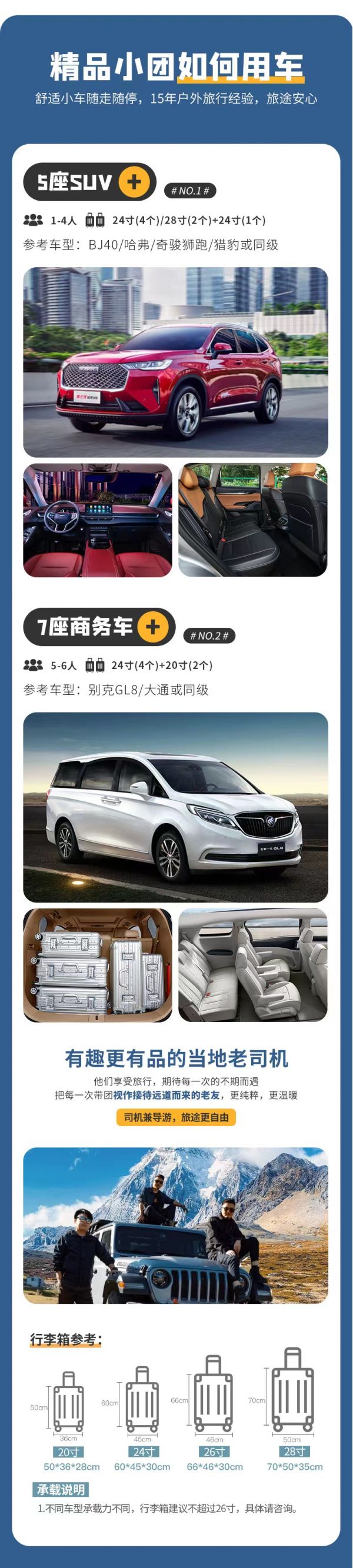 交通:2-6人VIP私享小團全程舒適SUV/商務車出行;車型大小根據(jù)實際人數(shù)安排,且由駕駛經驗豐富的司機為您的出行保駕護航,報價包含車費、油費、停車費、維修費及司機勞務費。