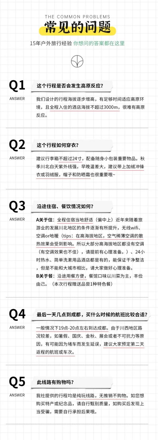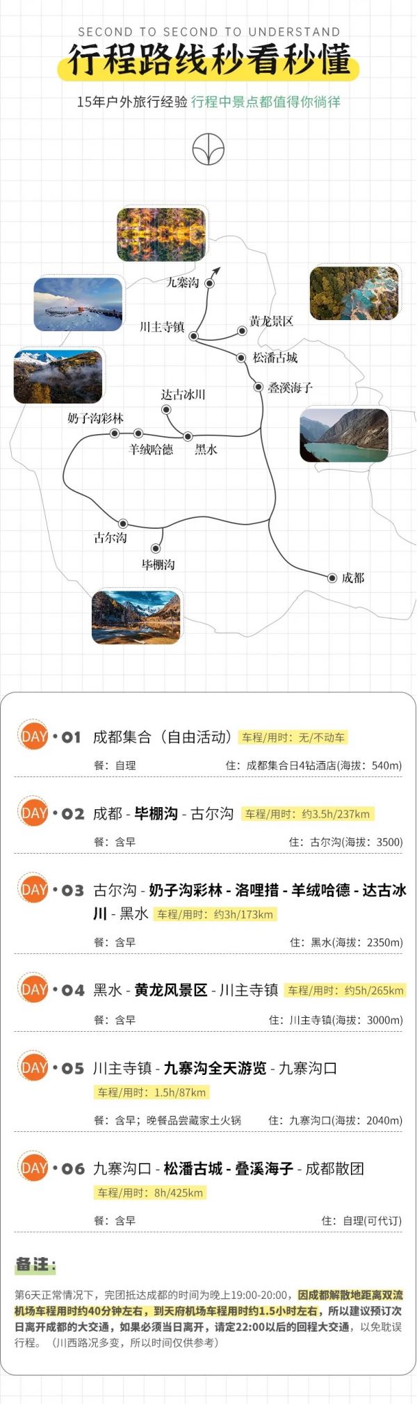 (1)以上行程時間安排可能會因天氣、路況等原因做相應(yīng)調(diào)整,正常情況下完團回到成都時間為晚上19:00至20:00左右,如果必須當(dāng)日離開,請定22:00以后的回程大交通,以免耽誤行程,敬請諒解;