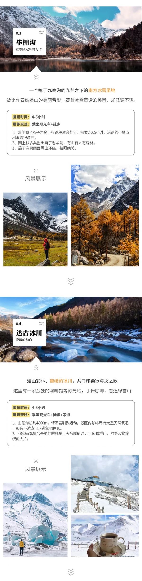 而后乘車前往【達古冰川】,達古冰川是全球海拔最低、面積最大、年紀最輕的冰川,這兒的秋天既有秋的絢麗,又有冬的純凈,宛若一個五彩斑斕的童話世界。我們從景區(qū)門口坐觀光車(70元/人,費用自理,必須乘坐)到索道口的路上會遇見大大小小的湖,湖畔色彩斑斕的彩林倒映在湖面上,與湖底的顏色混合成了一個異彩紛呈的彩色世界,遠處的雪山在陽光下,顯得更加的雄偉壯觀、如夢如幻。很快我們就能到達金絲猴經(jīng)常出沒的【金猴湖】,如果足夠幸運,在這里能看到金絲猴,隨后游覽【紅軍湖】、【紅軍橋】、【神牛湖】,欣賞沿途的美景。后到達索道下站,也就是觀光車終點站,從這里開始就是達古冰川的精華景點,10-11月紅葉彩林漫山遍野,層林盡染,猶如一幅彩色油畫。我們可以在索道下站坐索道直接上到山頂?shù)谋ǜ沟?,看連綿雪山冰川,觀賞【一號冰川】,感受一覽眾山小,俯視一切的雄壯氣概。還可以在世界上海拔最高的咖啡館,同時也被稱為【世界上最孤獨的咖啡館】,喝上一杯咖啡,飽覽美景??催^冰山下的秋景前往黑水縣入住。