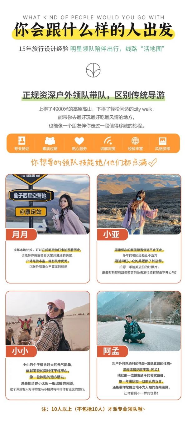 服務(wù):優(yōu)秀領(lǐng)隊服務(wù)(2-10人司機兼向?qū)В?1人及以上配專職領(lǐng)隊,已含領(lǐng)隊食宿門票);