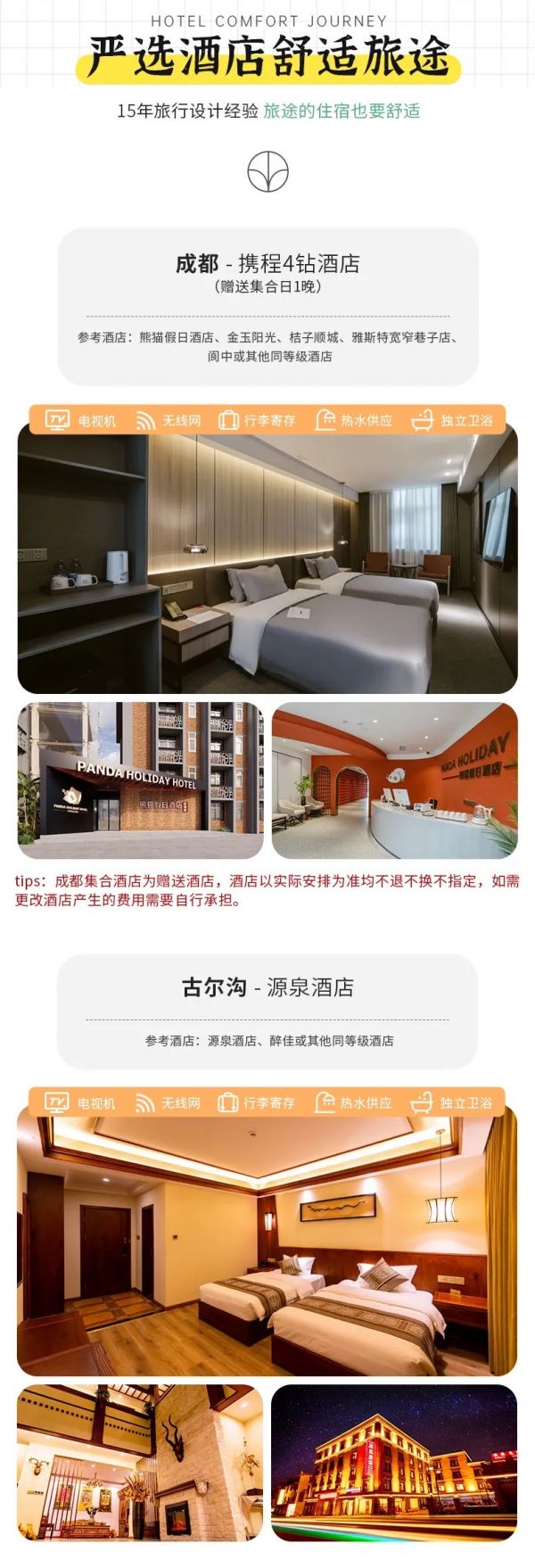 住宿:含全程5晚舒適酒店。(tips:成都集合酒店為贈送酒店,酒店以實際安排為準均不換不退不指定,如要更改酒店產(chǎn)生的費用需要自行承擔(dān)。)