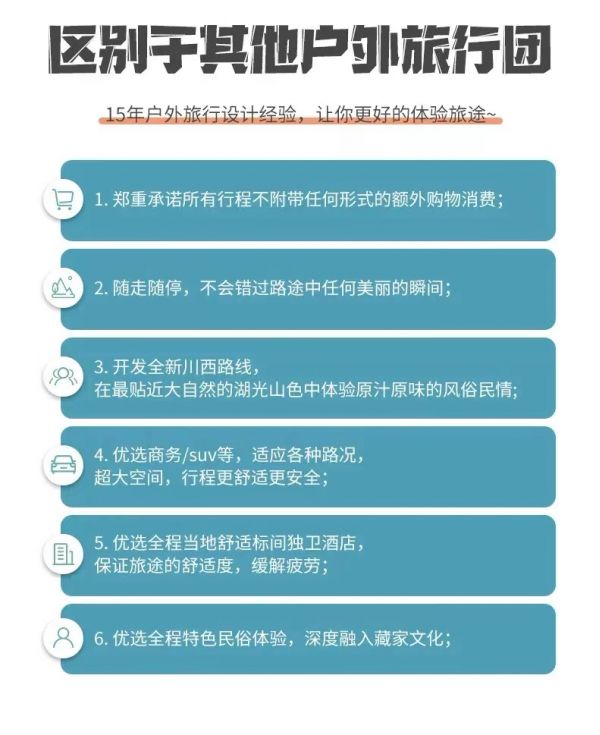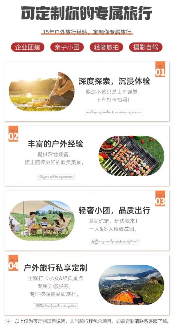 私人訂制:我們業(yè)務(wù)范圍囊括了全國各大城市,川西、西北、新疆、西藏,在路上永遠(yuǎn)有我們的身影。我們將為每一個有定制需求的你策劃出獨(dú)屬于自己的完美旅行。
