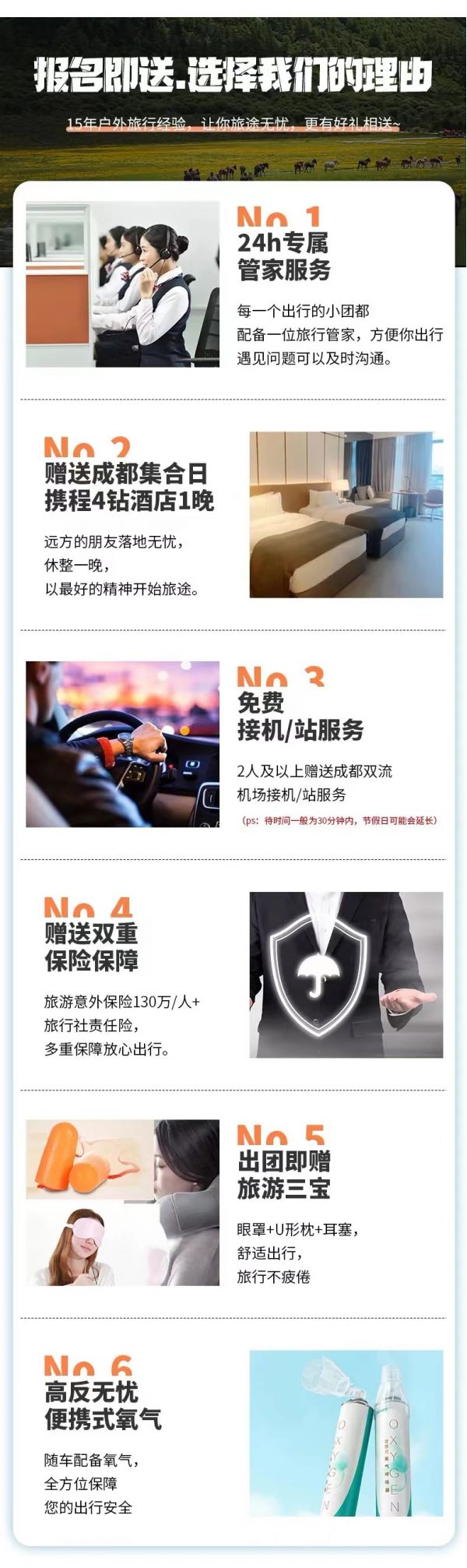 5、該線路為特種線路,當(dāng)?shù)鼐频昙安惋嫍l件無法與城市相比,請游客做好心理準(zhǔn)備;賓館內(nèi)無牙膏牙刷、拖鞋等一次性衛(wèi)生用品,請自備個人衛(wèi)生用品;沿途商店較少,民俗習(xí)慣亦有不同,游客可自備咸菜、小吃、干糧等零食,以備不時之需。