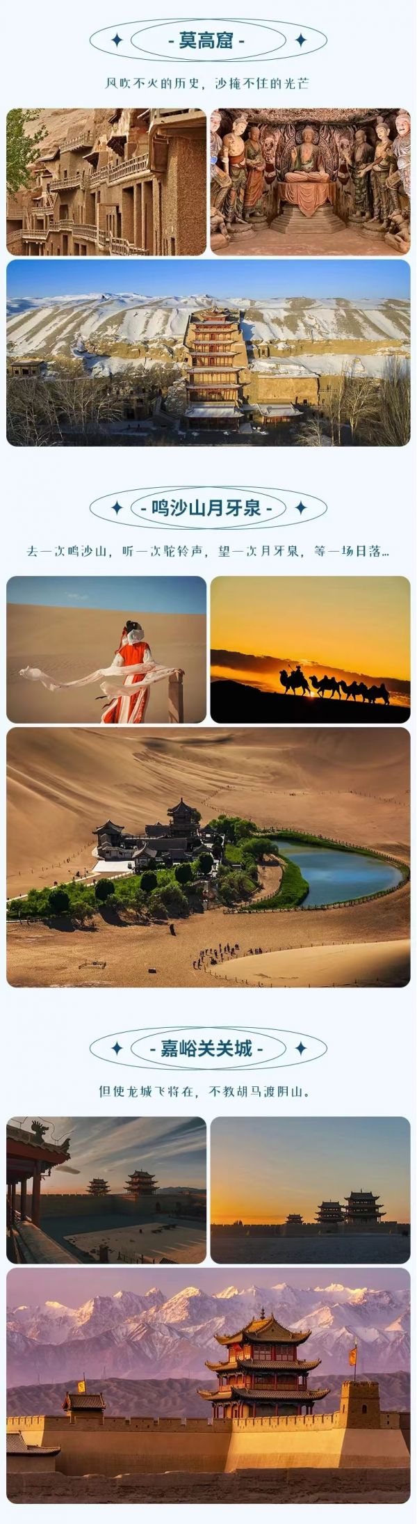 5.關(guān)于莫高窟門票的說明:正常門票238元/人,每天限6000張,可游覽八個洞窟。應急票148元/人,每天限12000人,可游覽四個窟。旅游旺季一票難求,請報團后及時到“莫高窟預約網(wǎng)”公眾號自行購買門票。(提前一個月內(nèi)均可購買,具體方法可私信客服)