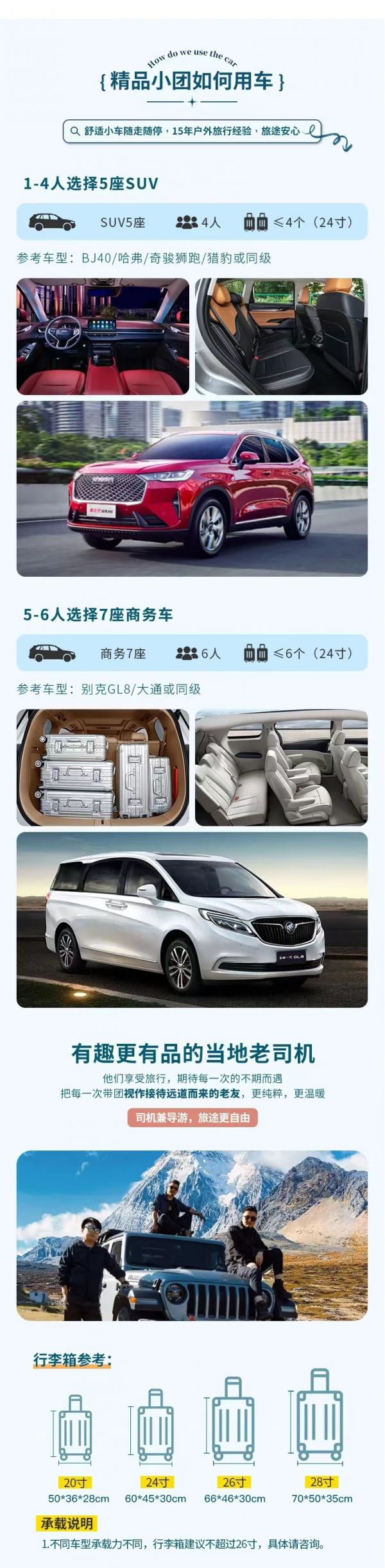 交通:2-6人VIP私享小團,全程舒適商務車出行,車型大小根據(jù)實際人數(shù)安排,保證一人一正座位,且由駕駛經(jīng)驗豐富的司機為您的出行保駕護航,報價包含車費、油費、停車費、維修費及司機勞務費。住宿:行程所列6晚住宿。我們會提供行程內(nèi)展示照片的酒店或其他條件相似酒店,但因沿途條件有限,如酒店設(shè)施達不到您的期望,請您諒解。