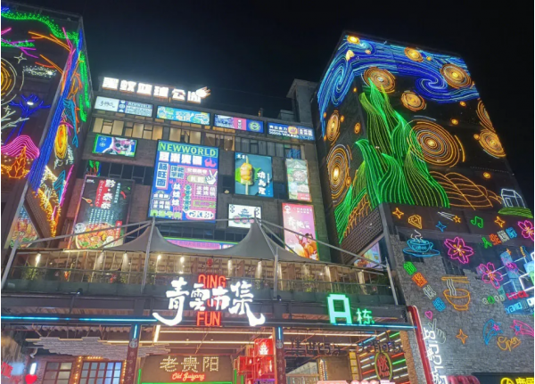 結(jié)合了游玩、餐飲美食、潮流文創(chuàng)、休閑娛樂(lè)、運(yùn)動(dòng)體驗(yàn)等豐全方位豐富多彩的“網(wǎng)紅街”。特別是滿街燈光渲染的文藝設(shè)計(jì)和文字圖案,構(gòu)成了這個(gè)號(hào)稱貴陽(yáng)最適合打卡拍照、游玩、品美食的休閑好去處。