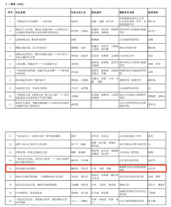 由山東省總工會、山東省文化和旅游廳、山東省新舊動能轉(zhuǎn)換綜合試驗區(qū)建設(shè)辦公室、山東省人力資源和社會保障廳、山東省教育廳、山東省農(nóng)業(yè)農(nóng)村廳、山東省精品旅游促進(jìn)會共同主辦,山東省精品旅游促進(jìn)會組織實施的“2023第四屆山東省研學(xué)旅行創(chuàng)新線路設(shè)計大賽暨首屆山東省研學(xué)旅行指導(dǎo)師技能大賽”的評審工作,嚴(yán)格按照統(tǒng)一報名參賽、網(wǎng)絡(luò)投票、專家評審、組委會審核等程序,研究確定了獲獎名單。聊城職業(yè)技術(shù)學(xué)院旅游管理系師生工作室團隊不負(fù)眾望,喜獲“2023第四屆山東省研學(xué)旅行創(chuàng)新線路設(shè)計大賽”二等獎。