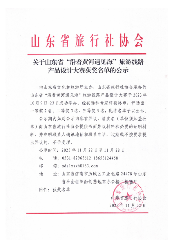 最后,恭喜劉寶平老師榮獲“沿著黃河遇見?!甭糜尉€路產(chǎn)品設(shè)計大賽一等獎!相信他的設(shè)計將為廣大游客帶來獨特的旅游體驗,同時也為聊城市旅游事業(yè)注入了新的活力和魅力。讓我們一起期待更多優(yōu)秀的旅游線路設(shè)計和創(chuàng)意的誕生!