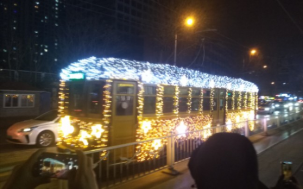 在中國《節(jié)日序曲》優(yōu)美歡快的旋律中,百年老電車的銅鈴“叮當(dāng)”響起,這輛流光溢彩的“光影電車”正式起程。