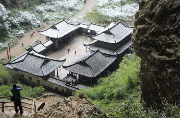 房屋位于道旁,屋頂被天龍橋萬(wàn)丈深淵所籠罩。四周巖石崢嶸,灌木蒼翠,有一種蕭煞之氣。