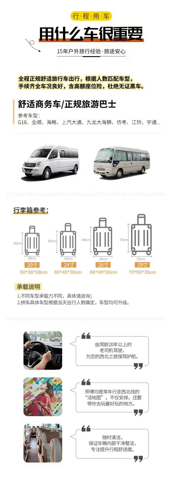 ● 服務(wù):10人及以上(包含10人),提供持證正規(guī)領(lǐng)隊(duì)服務(wù);10人及以下,由經(jīng)驗(yàn)豐富的司機(jī)帶隊(duì),無單獨(dú)導(dǎo)游服務(wù),請諒解。