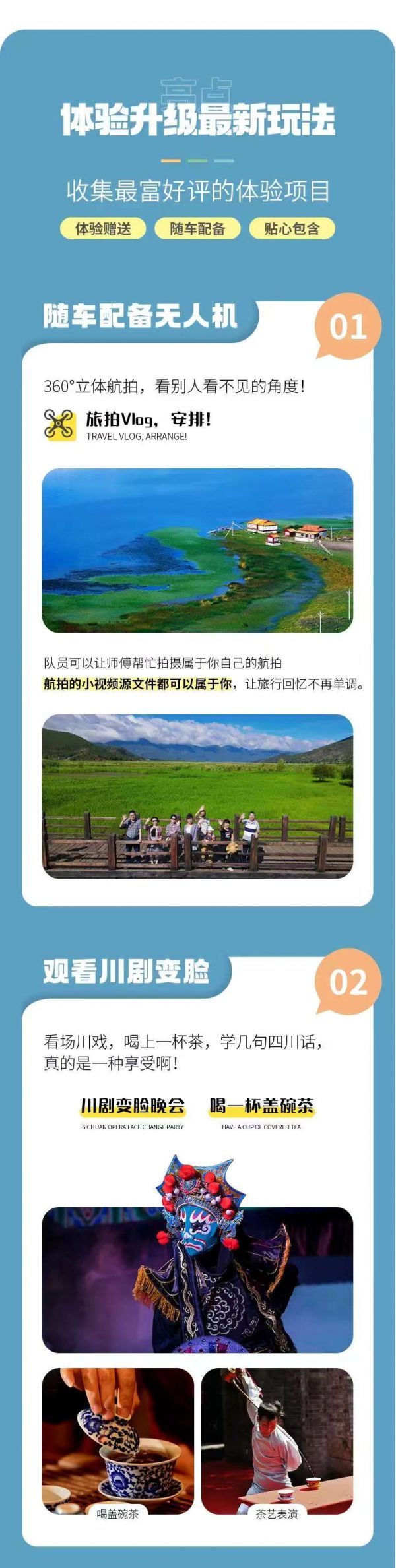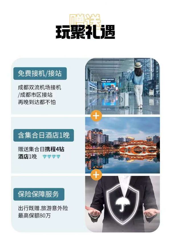 返回成都統(tǒng)一散團(由車上游客協(xié)商一致送至統(tǒng)一散團點,若協(xié)商不成則由司機送至三環(huán)內(nèi)就近地鐵站散團),結(jié)束本次愉快的旅行。由于川西地區(qū)路況復雜,有可能因為堵車而發(fā)生延誤,請大家盡量預定第二天返程的航班或車次。