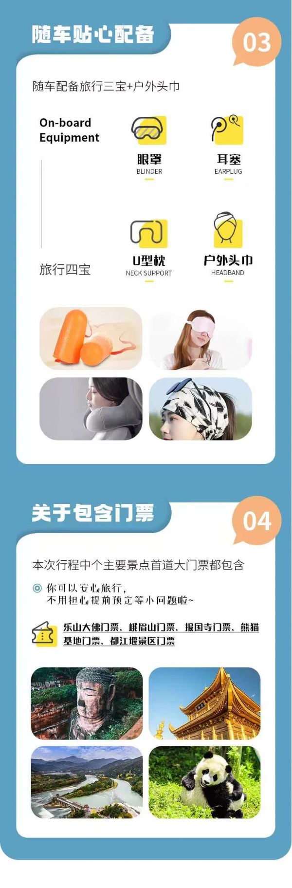 門票:樂山大佛門票、峨眉山門票、報國寺門票、熊貓基地景區(qū)門票、都江堰景區(qū)門票