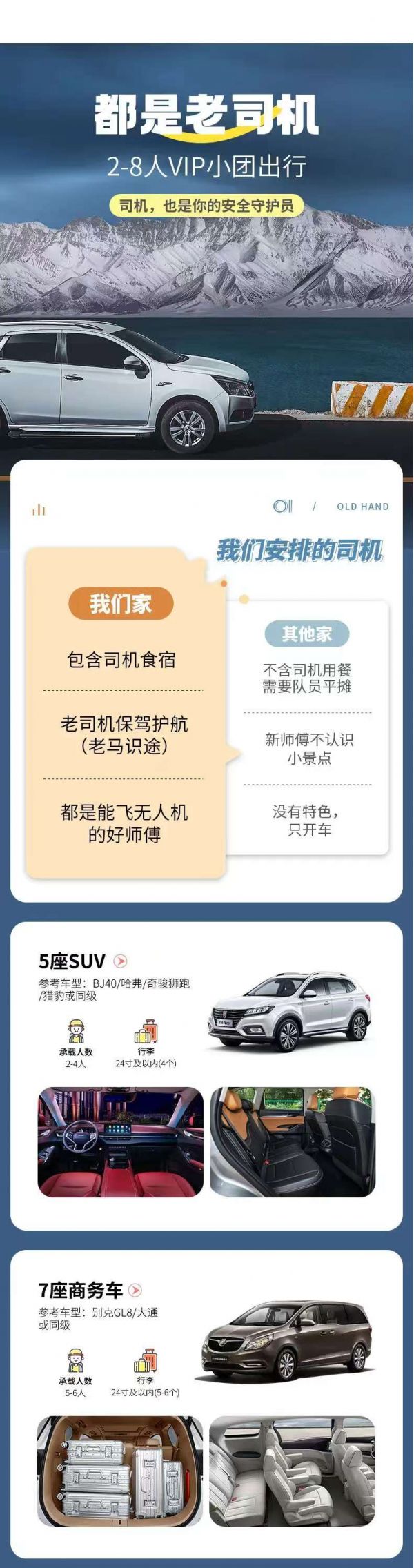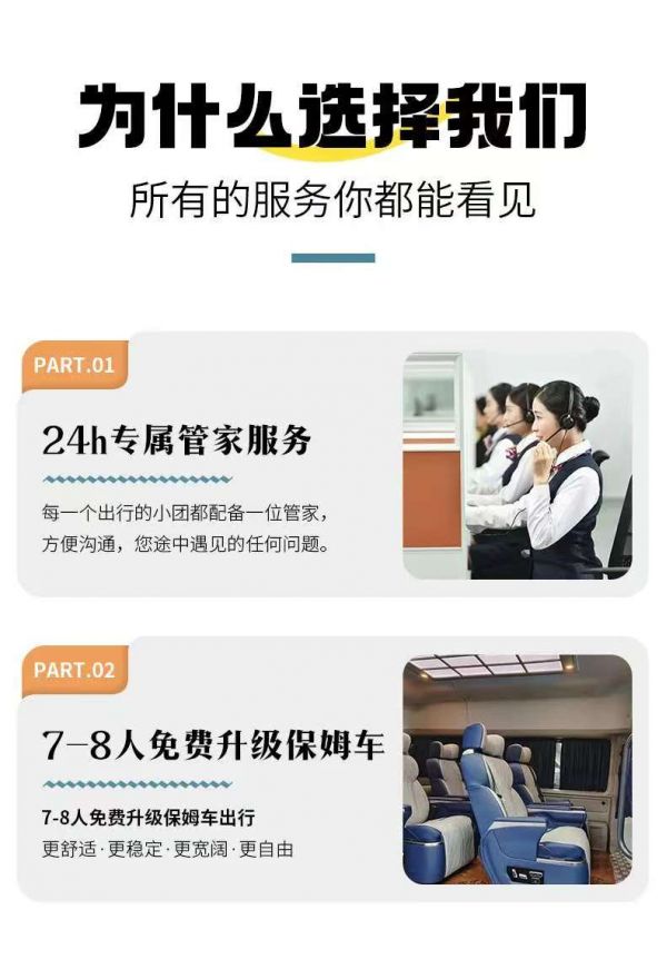為保證成團及質(zhì)量,根據(jù)人數(shù)派不同座位數(shù)用車,保證每人一正座;