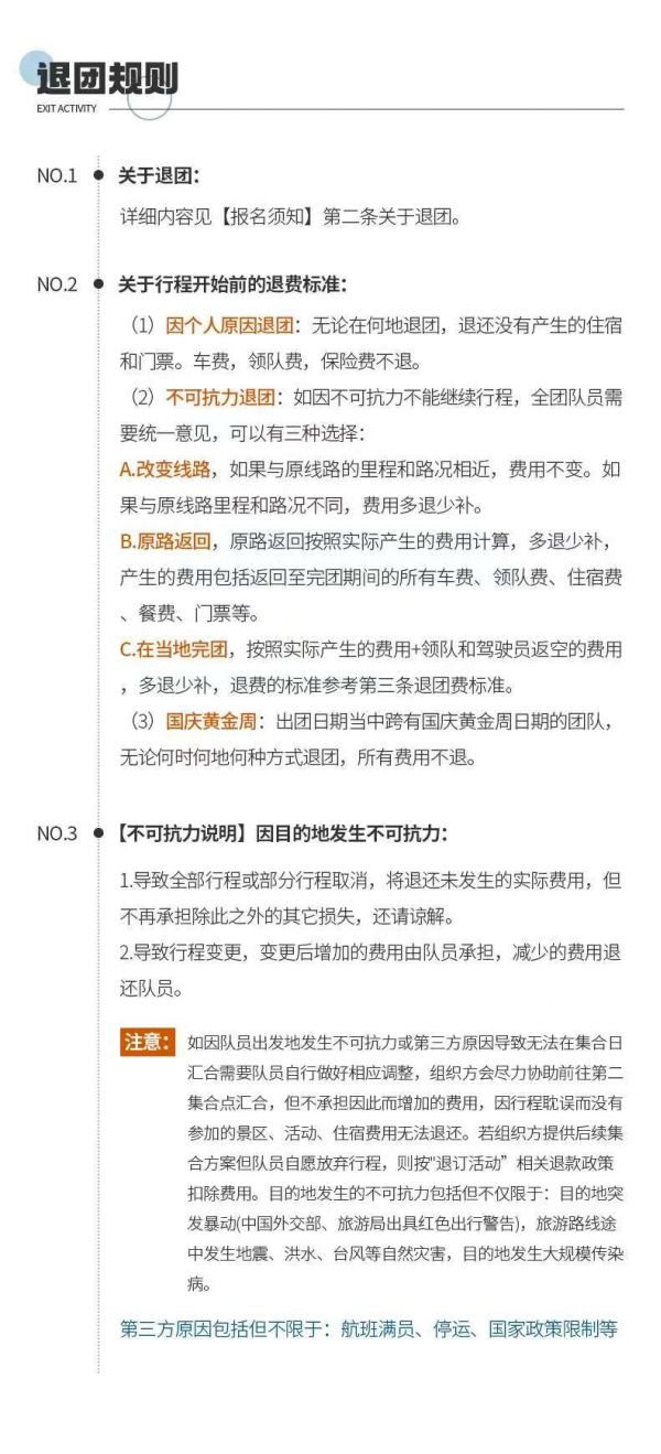 不可抗力:因不可抗力因素造成團隊行程更改、延誤、滯留或提前結(jié)束時,旅行社可根據(jù)當時的情況全權(quán)處理,如產(chǎn)生費用增減,按未發(fā)生費用退還游客,超支費用由游客承擔的辦法處理。