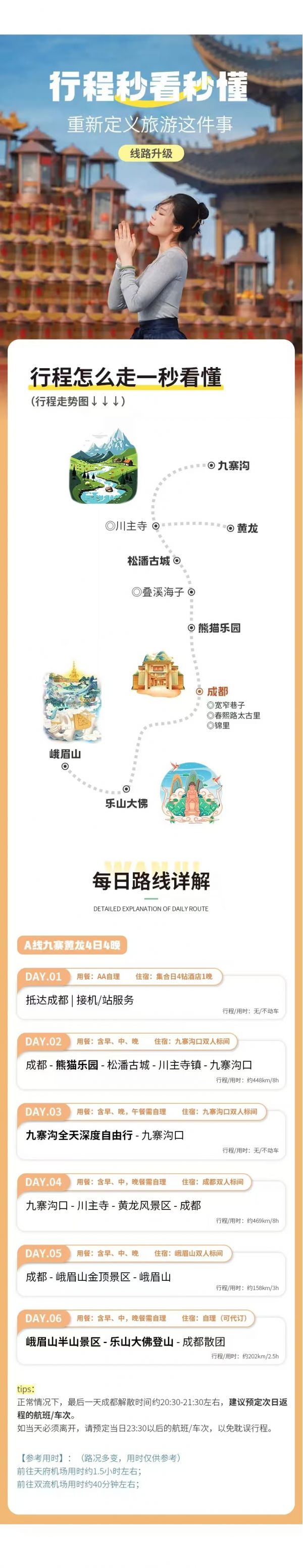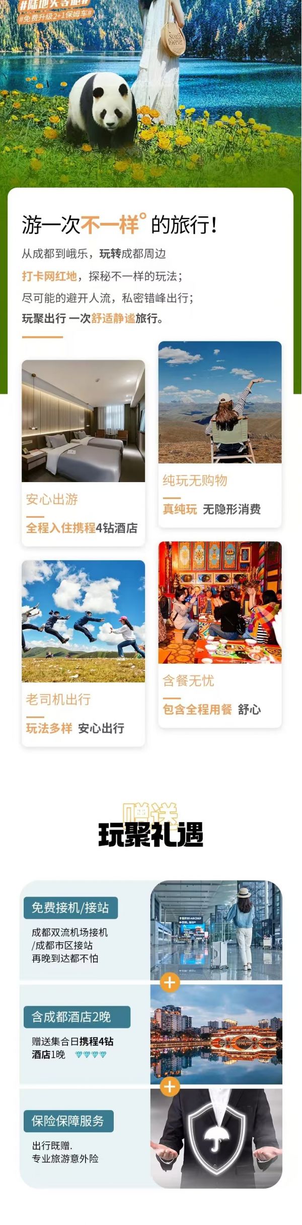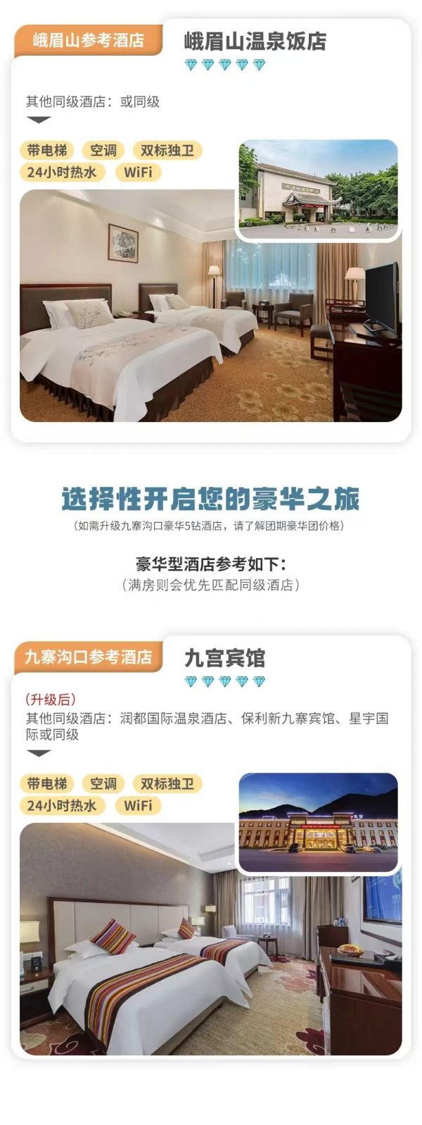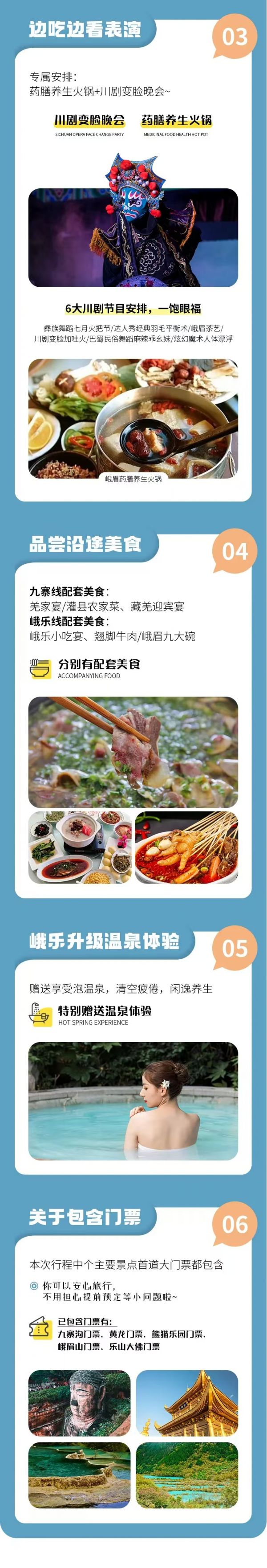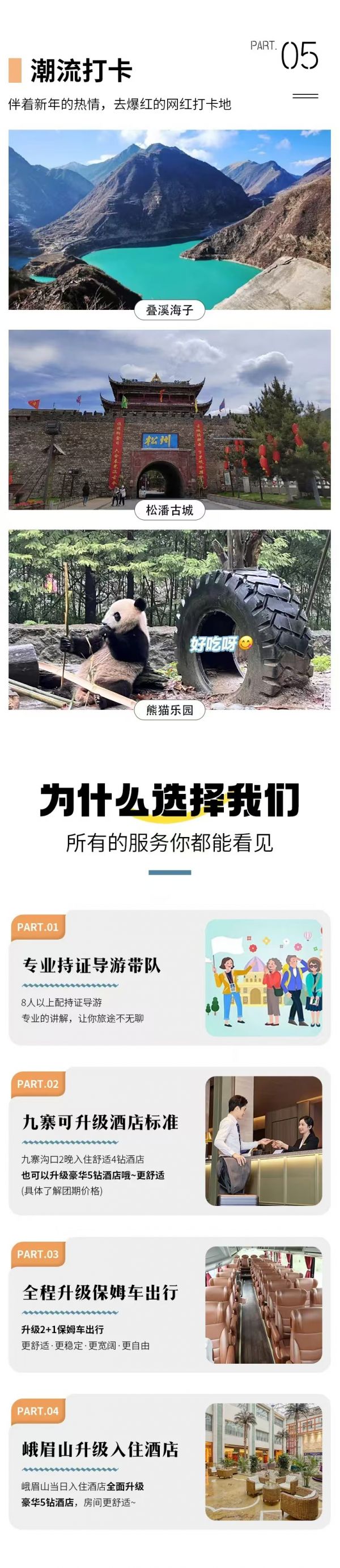 贈(zèng)送:九寨溝景區(qū)旅拍2張精修+底片全送(電子版)、峨眉山溫泉體驗(yàn)、川劇變臉表演晚會(huì)、專業(yè)旅游意外險(xiǎn)(不含財(cái)產(chǎn)險(xiǎn))、2人以上24H成都雙流機(jī)場接機(jī)/成都市區(qū)車站接站