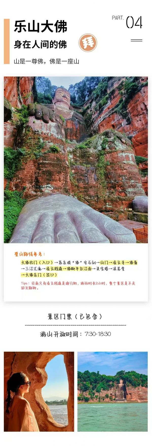 用午餐,品嘗世界非物質(zhì)文化遺產(chǎn)-翹腳牛肉或峨眉地道九大碗(根據(jù)實(shí)際情況2選1安排),步行約15分鐘至迎春橋,乘坐旅游車來到樂山。深度登山游覽樂山大佛景區(qū)(參觀約3小時(shí))步行333個(gè)臺(tái)階到達(dá)山頂,觀賞世界第一大彌勒坐佛-樂山大佛、凌云寺、九曲摘道、大雄寶殿、靈寶塔,在瞻仰樂山大佛宏偉氣勢的同時(shí),體驗(yàn)”蜀道難、難于上青天的感覺”,抱千年佛腳后,游漫山的石刻佛像、凌云寺、靈寶塔從東門下山返回到停車場。