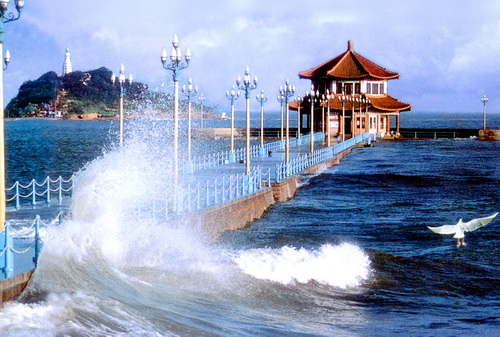 棧橋是青島的象征。位于青島灣中,與市內(nèi)最繁華的中山路成一條直線,由海岸前伸入海,素有“長虹遠(yuǎn)引”之美譽(yù)。棧橋初建于光緒十八年(公元1892年),是青島最早的碼頭。經(jīng)1931年改建和1985年整修,現(xiàn)寬8米,全長440米。版權(quán)所有山東聊城聊之旅國際旅行社有限公司,轉(zhuǎn)載必究!橋南端筑半圓形防波堤,堤內(nèi)是一座具有民族風(fēng)格的兩層八角亭,金瓦朱壁,盔頂飛檐,題名“回瀾閣”。棧橋劃波斬浪,像一條長龍橫臥于碧海銀波。循橋漸入,仿佛走進(jìn)大海的懷抱;佇立閣旁,層層巨浪澎湃涌來,拍打堤壩,擊起萬千碎玉;入閣內(nèi),沿螺旋樓梯登到樓上,四周盡是寬敞的大窗,放眼望去,又是另一番怡人風(fēng)景,“飛閣回瀾”因此被譽(yù)為“青島十景”之一。