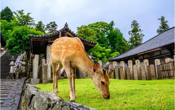 【奈良鹿公園】(約40 分鐘)奈良公園位于奈良東部、春日山腳下,占地面積為 8 平方公里。奈良人深信祖先是騎著鹿而來(lái)的,所以對(duì)鹿相當(dāng)崇敬,奈良公園內(nèi)就有 1200 多頭受市政府保護(hù)的野生梅花鹿隨意漫步,游人來(lái)到這里也能夠和 它們親密接觸。園內(nèi)到處都有售賣“鹿餅”的攤販,只要游客的手中拿有鹿餅,就會(huì)立刻被許多鹿環(huán)繞其中,感覺非常 奇特。春季嫩枝發(fā)芽櫻花綻放、秋季滿園楓葉的奈良公園都令人心曠神怡,而在其他季節(jié)也很適合悠閑自在地漫步。