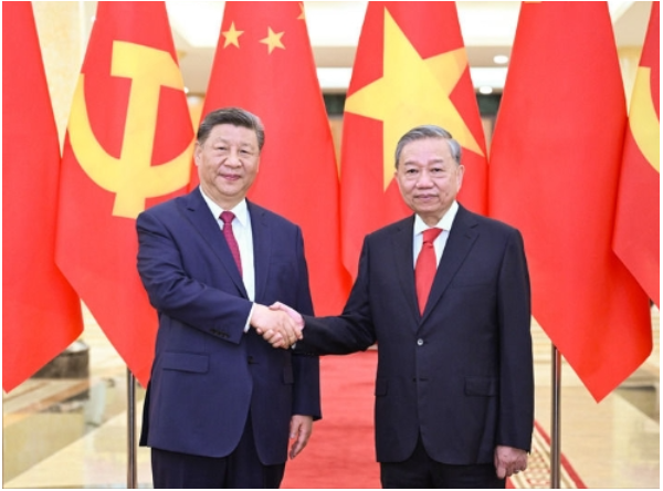習(xí)近平指出,很高興對越南進(jìn)行國事訪問,實(shí)現(xiàn)同蘇林總書記的首輪互訪。今年是越南共產(chǎn)黨成立95周年、越南建國80周年和南方解放50周年,我代表中國共產(chǎn)黨和中國政府向越方致以熱烈祝賀。中方將一如既往支持越南走好符合本國國情的社會(huì)主義道路,勝利召開2026年越共十四大,朝著建黨建國“兩個(gè)一百年”奮斗目標(biāo)不斷邁進(jìn)。