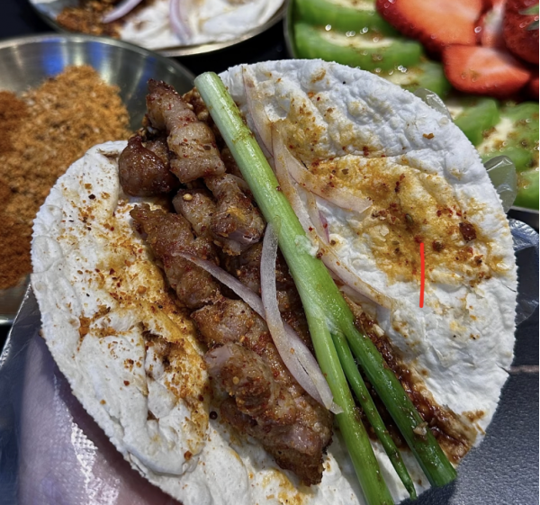 淄博燒烤獨(dú)特的“小烤爐+肉卷小餅+蔥+醬”吃法,是其風(fēng)靡全國的制勝法寶 。每個(gè)餐桌都配備一個(gè)小火爐,服務(wù)員會(huì)將七八分熟的烤串送到桌上,接下來就輪到顧客親自上陣。在小火爐上,烤串嗞啦冒油,將肉一把擼下,用巴掌大、烙至起泡的小餅一包,再加上脆嫩的山東嫩蔥,灑上自己調(diào)配的辣醬等蘸料,一口下去,麥香、肉香、蔥香與蘸料的香味完美融合,碳水化合物解油解膩,豐富多樣的配料刺激著味蕾,形成了獨(dú)特的“淄博Taco”。
