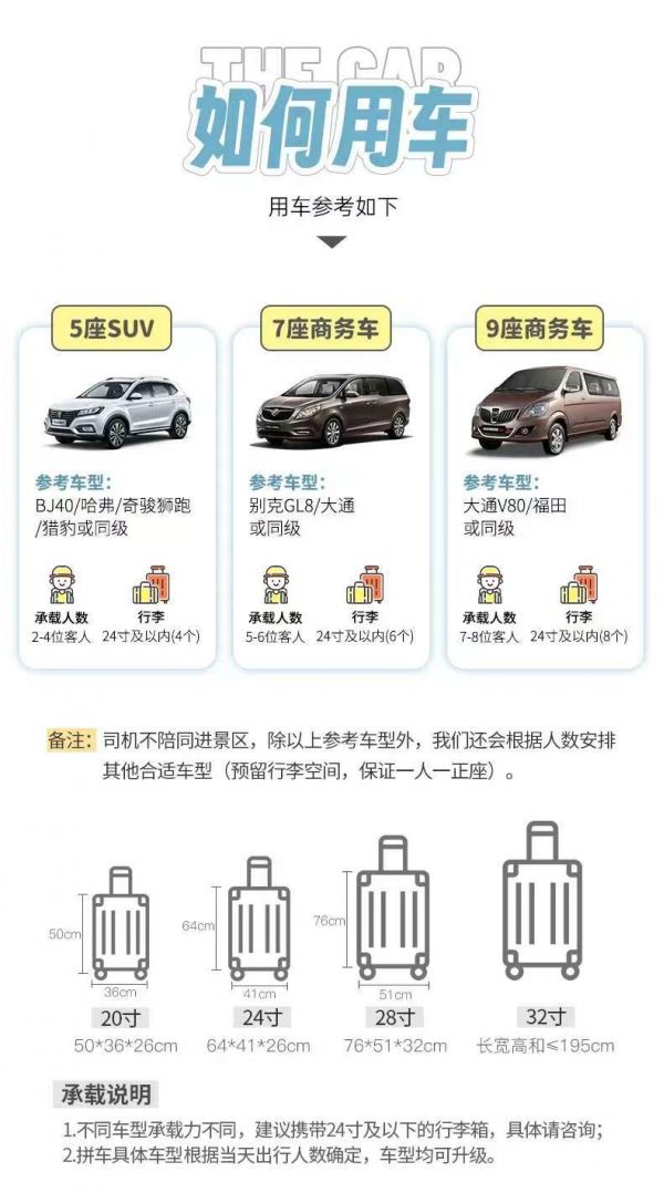 為保證成團及質(zhì)量,根據(jù)人數(shù)派不同座位數(shù)用車,保證每人一正座;