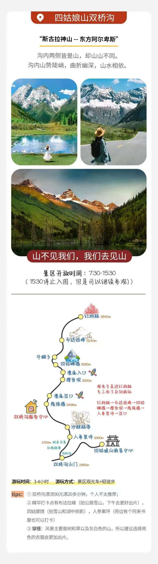 因雙橋溝有限流要求,如遇票滿,我們將更換安排海子溝和長(zhǎng)坪溝的門(mén)票,以上兩個(gè)景點(diǎn)也同屬四姑娘山。