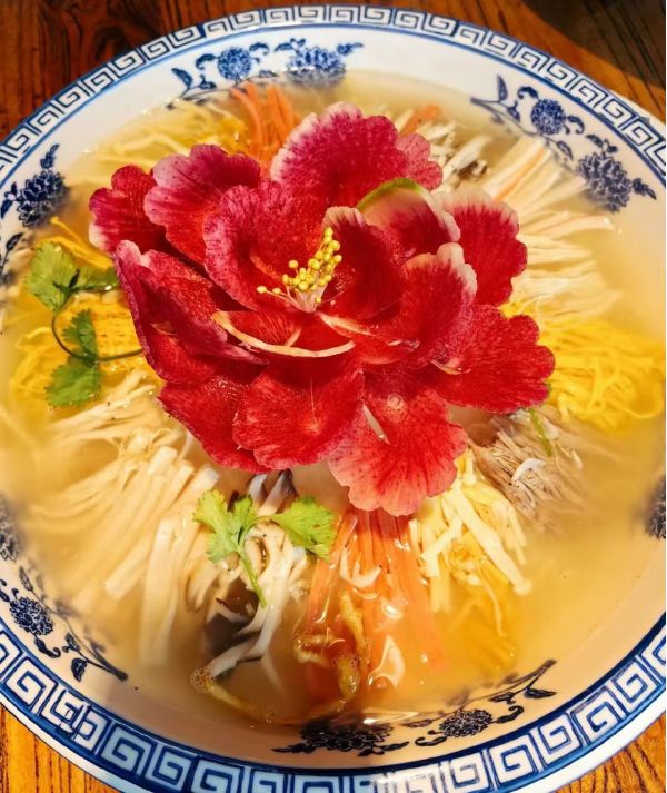 菜品特色:造型別致,盛開(kāi)的“牡丹”浮于湯面,色彩絢麗;口感豐富,蘿卜絲軟嫩爽滑,有“燕窩”的質(zhì)感,各種配菜味道醇厚鮮美,湯汁酸辣開(kāi)胃,兼具觀賞性與美味度,體現(xiàn)了洛陽(yáng)飲食文化的深厚底蘊(yùn)。