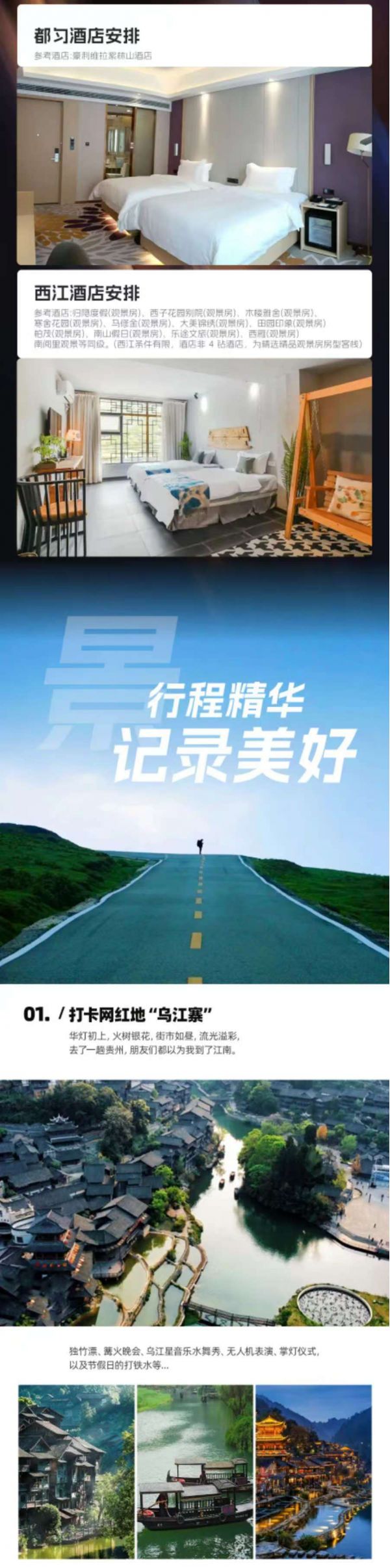 下午:午餐后乘車(chē)前往【烏江寨】國(guó)際旅游度假區(qū),車(chē)程約2.5H(景區(qū)電瓶車(chē)已包含,不限次數(shù)乘坐),江南千條水,云貴萬(wàn)重山,一灣烏江碧水飄落在山間,如黛青山擁簇著烏江寨,兩岸吊腳樓錯(cuò)落有致,滿滿的黔北風(fēng)情,宛若治愈力拉滿的世外桃源,青山、綠水、吊腳樓、青磚黛瓦、民居、民俗、水舞秀...描繪出一幅黔北民居群落的壯美畫(huà)卷,在太乙閣碼頭坐上一艘搖櫓船,穿行在氤氳水汽之間,鱗次櫛比的吊腳樓撲面而來(lái),斜倚船頭,坐看云煙升騰,晨光下的美景猶如一幅水墨畫(huà)在眼前暈染開(kāi)來(lái)。景區(qū)是集觀光、休閑、度假、康養(yǎng)、會(huì)展為一體的大型綜合業(yè)態(tài)的旅游目的地。景區(qū)內(nèi)辦理入住酒店后自由游覽,晚上景區(qū)內(nèi)可以欣賞震撼壯觀的水舞秀、燈光秀、獨(dú)竹飄,無(wú)人機(jī)編隊(duì)表演等。