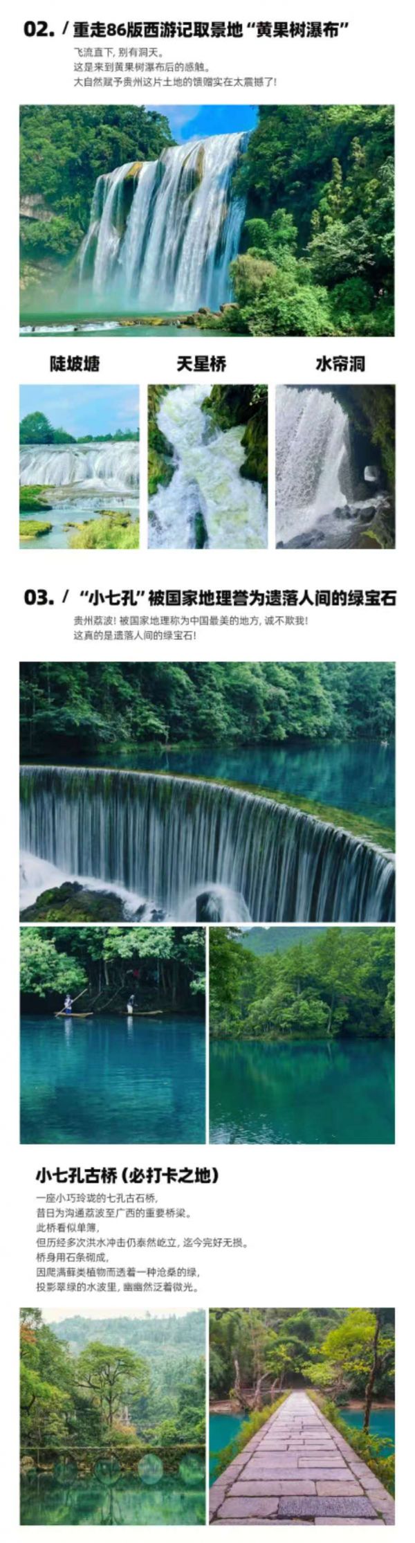 3、門(mén)票:黃果樹(shù)門(mén)票及電瓶車(chē)、織金洞門(mén)票及電瓶車(chē)(花期百里杜鵑門(mén)票及金坡/普底電瓶車(chē))、烏江寨門(mén)票及電瓶車(chē)、灑金谷門(mén)票、西江門(mén)票及電瓶車(chē)、小七孔門(mén)票及電瓶車(chē)、紅飄帶門(mén)票