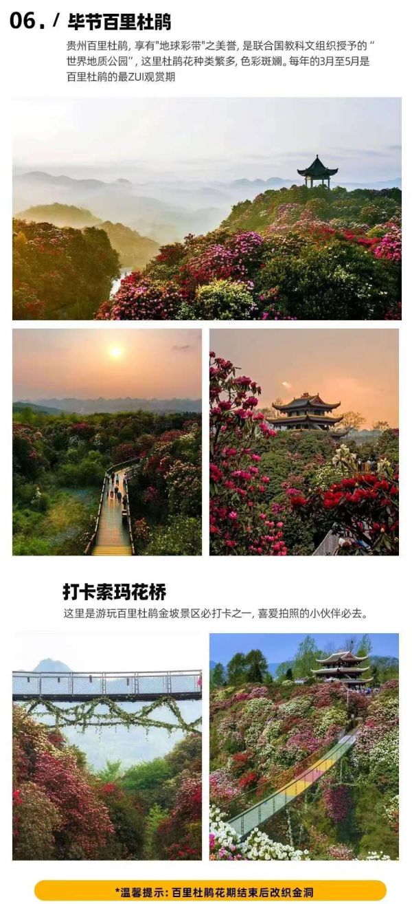 1、每年3-4月行程安排為百里杜鵑景區(qū),花期過(guò)后百里杜鵑景區(qū)替換成織金洞景區(qū),不同時(shí)安排游覽兩個(gè)景點(diǎn)。