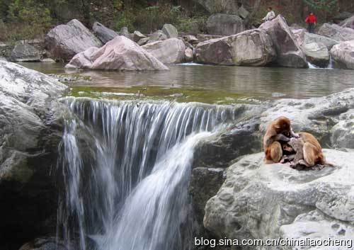 遠(yuǎn)遠(yuǎn)看到平臺(tái)就是游客們觀賞獼猴的地方。太行山獼猴屬于國(guó)家二類(lèi)保護(hù)動(dòng)物,是我國(guó)華北地區(qū)唯一殘留下來(lái)的面臨來(lái)絕的靈長(zhǎng)類(lèi)動(dòng)物,太行獼猴保護(hù)區(qū)是世界上獼猴分布的最北界,具有很高的欣賞價(jià)值、經(jīng)濟(jì)價(jià)值、保護(hù)價(jià)值和科學(xué)實(shí)驗(yàn)價(jià)值,被世界自然基金組織確定為具有國(guó)家和全球重要意義的A級(jí)保護(hù)區(qū)域。保護(hù)區(qū)山勢(shì)險(xiǎn)峻,林木茂密,清泉潺流,常有成群的獼猴出沒(méi)其間。獼猴共有四、五群,每群幾十只到百只不等。太行獼猴比南方獼猴個(gè)大、毛長(zhǎng)、絨厚、耐寒,而且都是雙眼皮,短尾巴,毛色光亮,形體俊美。它們性情活潑好動(dòng),愛(ài)打架嬉鬧,追逐跳躍。每群皆有猴王,各有勢(shì)力范圍。行動(dòng)時(shí),猴王率領(lǐng)哨猴在前,老、幼、母猴居中,強(qiáng)壯的雄猴在前后護(hù)衛(wèi),相互照應(yīng)。覓食或休息時(shí),哨猴在高處警衛(wèi),一有情況就大聲嘶叫,猴群隨即轉(zhuǎn)移,保證安全。正是深山風(fēng)光好,猴子自逍遙。