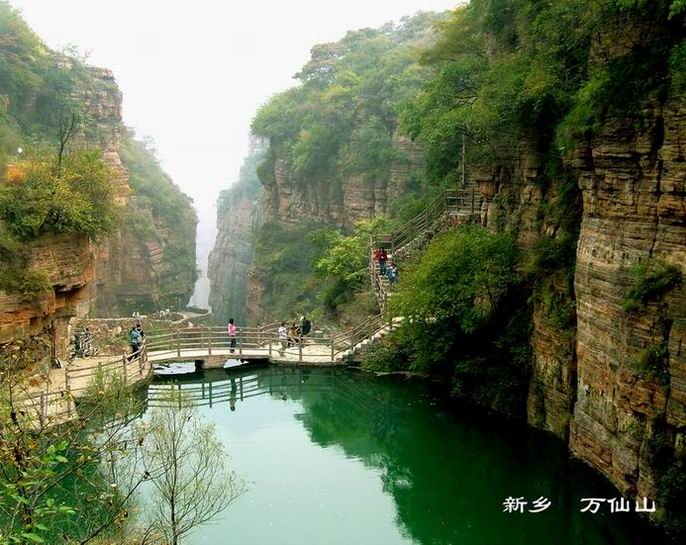 風光旖旎,景色秀麗的萬仙山位于太行山南麓,至峰頂可遠眺黃河,俯瞰牧野,一覽逶迤群山。萬仙山匯聚百里太行赤巖絕壁的精華,赤紅色的懸崖高越百米,似凝固的巖瀑石幕,曲折、盤旋、迂回、流暢的圍、隔、堵、截出八條深澗峽谷。飛瀑、洞穴、老樹、古寨、石墻、石街、石房子組成一個個鮮亮的景點。