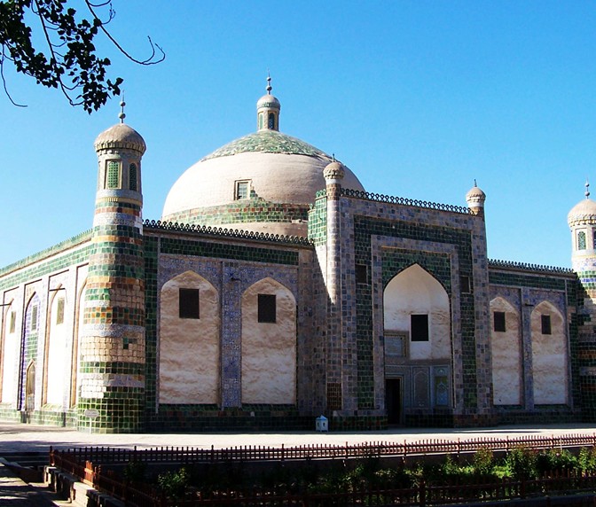 香妃墓坐落在喀什市東郊5千米的浩罕村,系自治區(qū)的重點(diǎn)文物保護(hù)單位。這是一座典型的伊斯蘭古建筑群,也是伊斯蘭教圣裔的陵墓,占地2公頃。 據(jù)說(shuō)墓內(nèi)葬有同一家族的五代72人(實(shí)際只見(jiàn)大小58個(gè)墓穴)。