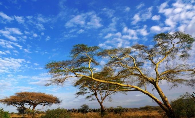 塞倫蓋蒂國家公園是坦桑尼亞最著名的國家公園,一個有著300多萬只大型哺乳動物的巨大生態(tài)系統(tǒng)植被以開闊草原型植物為主,但在嚴(yán)重干旱時幾乎全部變?yōu)樯衬V饕参锸邱R唐和鼠尾粟(鹽堿土壤的代表植物)等茅草。在較濕潤地區(qū),水蜈蚣屬植物生長占優(yōu)。公園中部為大片金合歡林地草原。