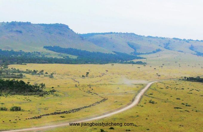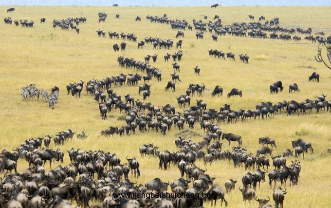 在塞倫蓋蒂草原上發(fā)生的一年一度的動物大遷徙是這個世界上最偉大的自然景觀,動物們靠遷徙的方式找尋水源和牧草。從空中俯瞰,遷徙的場面尤為壯觀--每年大約有150萬只牛羚和斑馬會在塞倫蓋蒂大范圍地巡游一周,它們就像一個巨大的隆隆作響的割草機(jī)在草原上一掃而過,還給大地的是平均每天450噸的糞便。除了牛羚和斑馬是這個舞臺的主角以外,走在這條遷徙路上的還有約30萬只湯姆森瞪羚和3萬只格蘭特瞪羚。不斷壯大的遷徙隊伍形成了一個觸目驚心的浩浩蕩蕩的獸群。