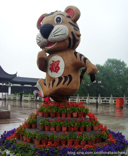 一只小老虎站立在那里,五顏六色的花圍繞。鮮紅的“福”字在虎的雕像上,看到此雕像的人一定會(huì)“福如東海”吧。
