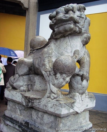 此石獅右蹄抬著一個(gè)石球,頭向后方微望,顯得多么威武啊,讓人望而生畏啊。