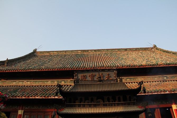 大雄寶殿重檐斗拱,雕梁畫揀,金碧交輝,其內(nèi)供奉有釋迦摩尼、阿彌陀佛和藥師佛三世佛,均高一丈三尺,其后是大型雕塑海島觀音,取材于《華嚴(yán)經(jīng)》善財(cái)童子53參的故事,形象地表現(xiàn)出南海觀音普渡眾生的場面,東西兩壁供奉的是十八羅漢。