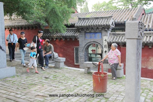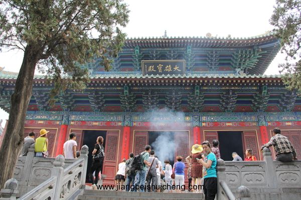 穿過天王殿,其后有大雄寶殿。殿內(nèi)供奉著釋迦牟尼、阿彌陀佛、藥師佛的神像,屏墻后面懸塑觀音像,兩側有十八羅漢侍立。大雄寶殿之后,又有藏經(jīng)閣藏書八百萬卷,這是寺僧藏經(jīng)說法的場所。